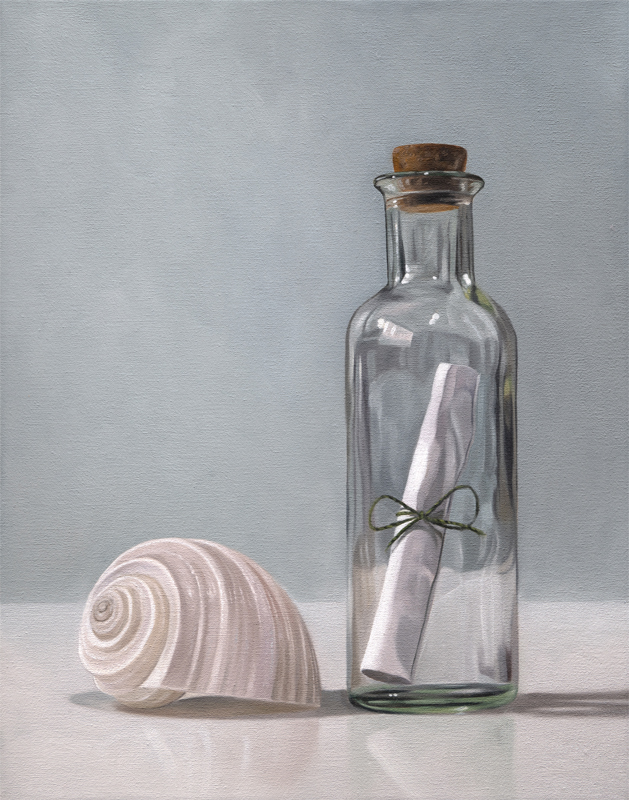 This painting features a light seashell resting next to a vintage bottle containing a rolled and tied paper message.
