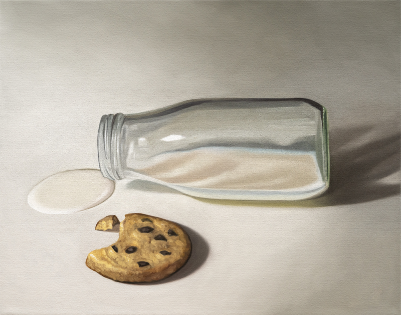 This painting features a spilled glass bottle of milk alongside a single chocolate chip cookie.