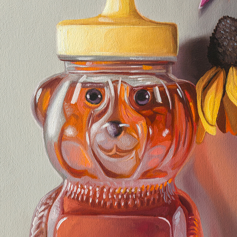 Introducing this week’s painting: “Bumble Bee, Honey & Blossoms.” As I worked on this piece, I couldn’t help but feel the end of summer creeping in on us—a bittersweet time of year when the days are still warm, but there’s a hint of change in the air. This painting is an ode to the end of summer, featuring a honey bear bottle surrounded by two freshly picked flowers from my yard—a vibrant Black-Eyed Susan and a graceful Purple Coneflower. A curious bumble bee hovers nearby, drawn to the last of the season’s blooms. Soft light filters in from the left, illuminating the scene and casting a warm, golden glow on the wall behind the honey.