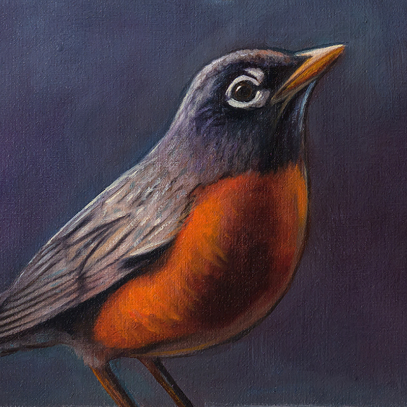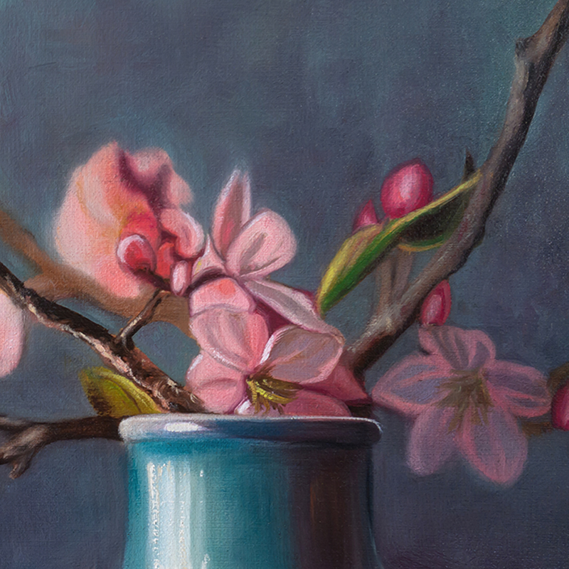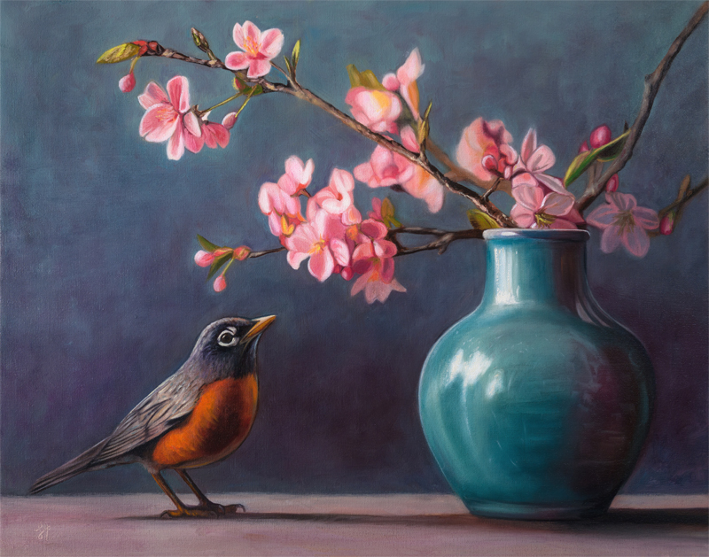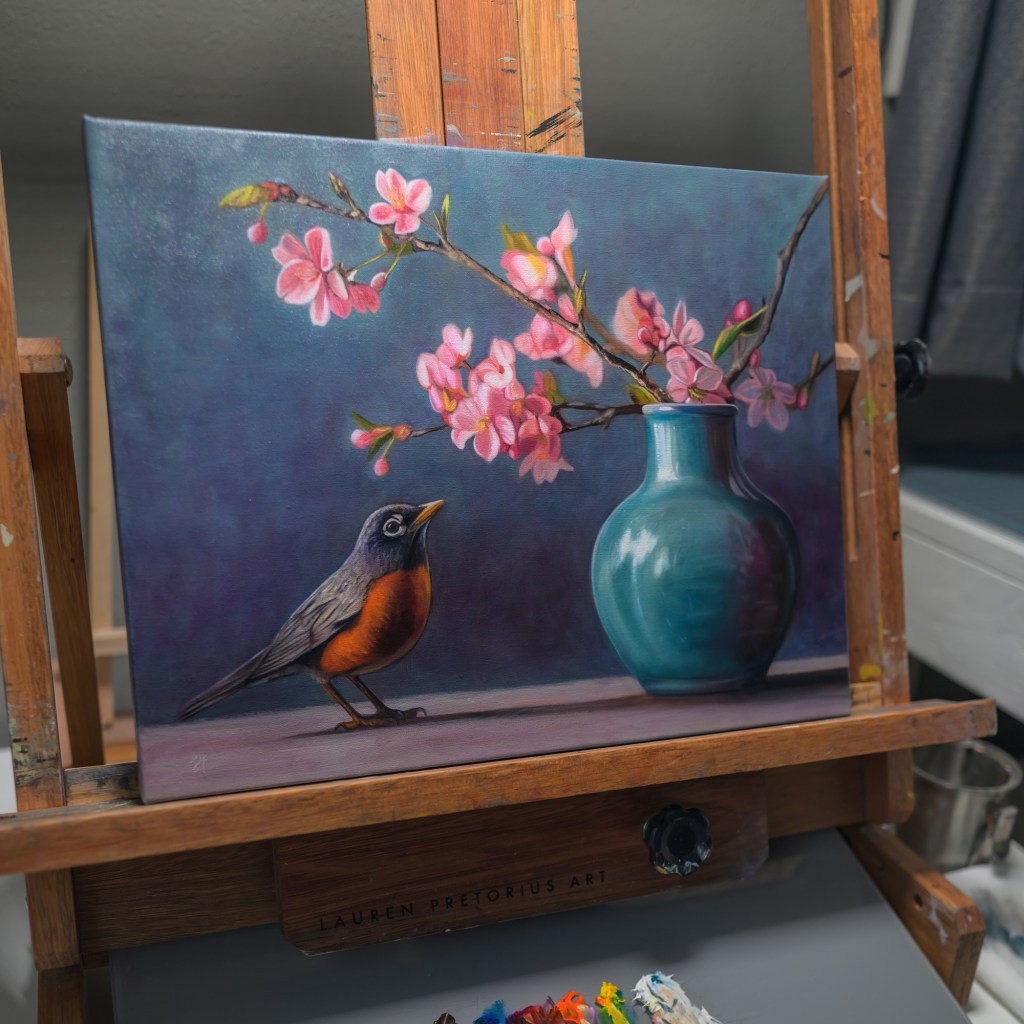 An ode to my favorite season – this oil painting captures the gentle spirit of spring. A robin stands beside a robin’s egg blue vase filled with cherry blossoms, all set against a rich, moody backdrop of turquoise and violet. It’s a quiet moment of renewal, where the air feels fresh and full of promise.