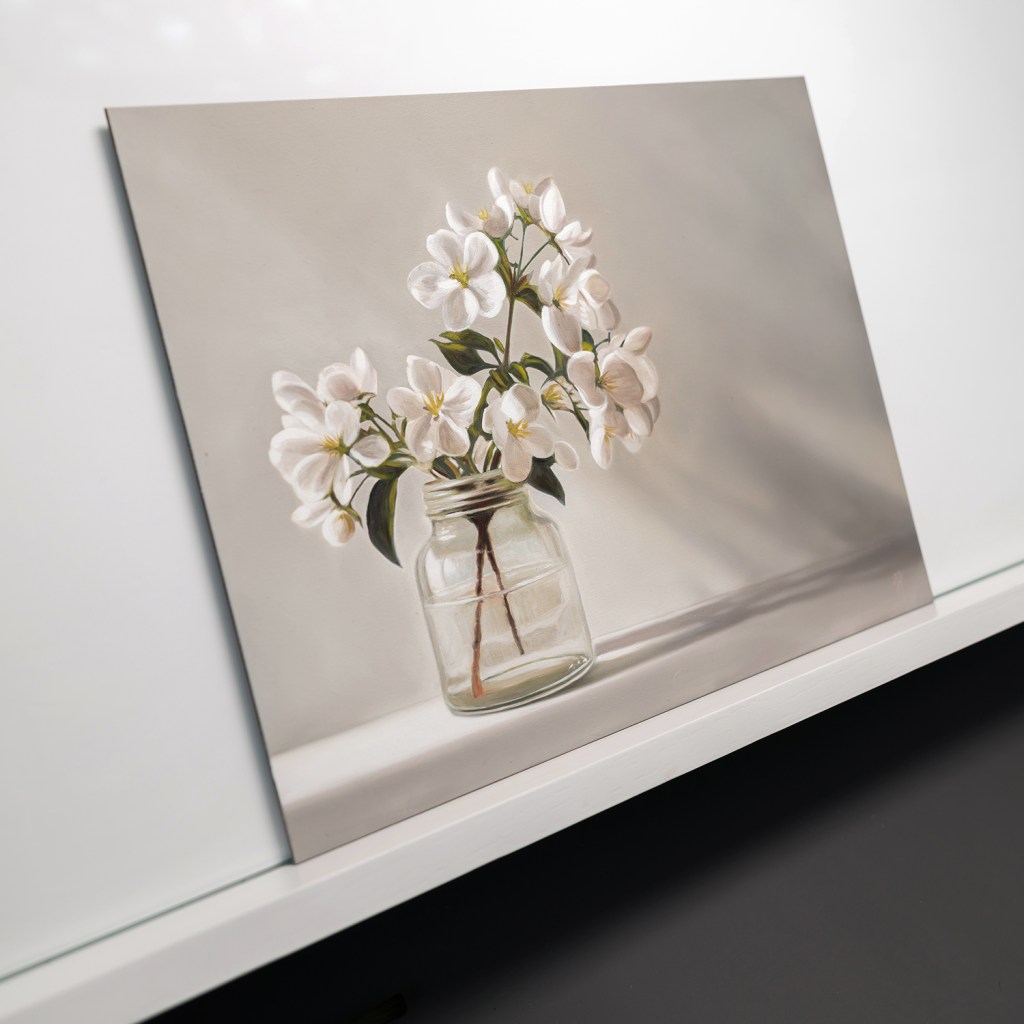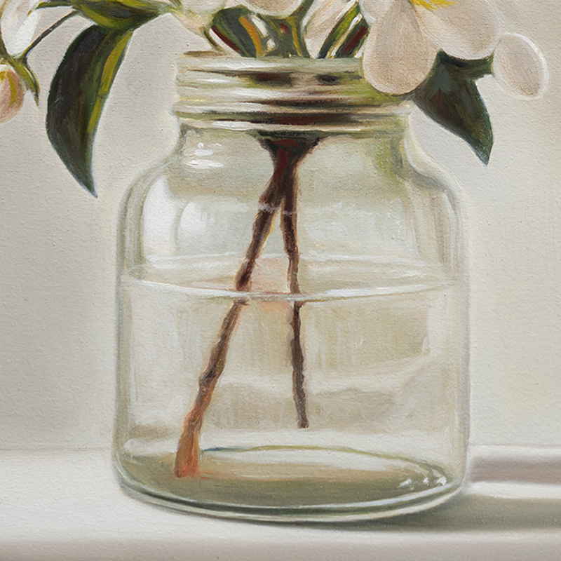 This week’s painting features a simple glass jar filled with freshly cut crabapple blossoms, capturing the delicate beauty of spring. The Spring Snow crabapple trees are in full bloom right now, and their sweet, floral scent fills the air everywhere you go. I couldn’t resist painting them!