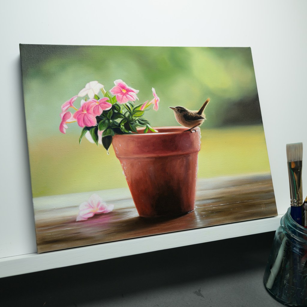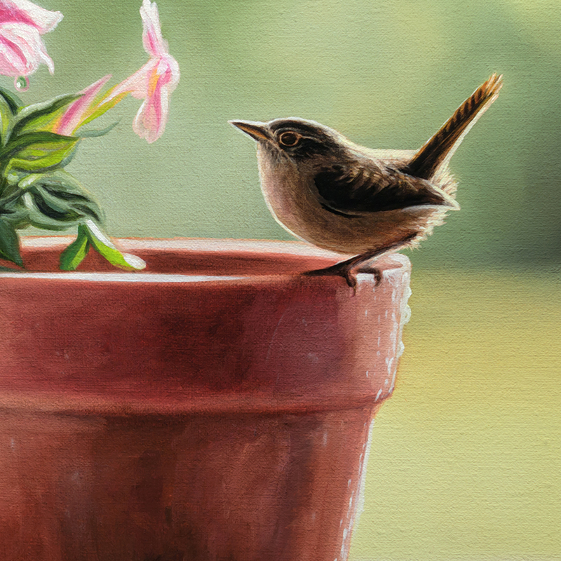 I just love the scent and freshness that follows a good spring rain – everything feels so alive! This week’s painting features a house wren perched on the rim of a terra cotta pot, still damp from the rain. Pink impatiens spill gently over the edge. Soft sunlight begins to filter in, bringing a renewed warmth to the scene.