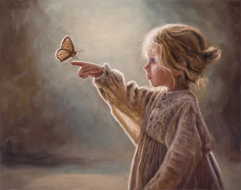 After over 20 years of painting still lifes in oil, I realized I had never once painted a person. Not a single figure, not even a hand. I think I was always a little intimidated by it – so this week, I finally decided to challenge myself! This painting is my first attempt at capturing the human form – a quiet moment of a child reaching out to a butterfly. I wanted it to feel nostalgic, dreamlike, and full of that wide-eyed wonder we all start out with.
