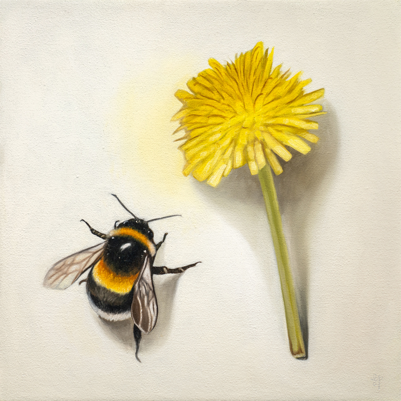 This painting features a solitary bumblebee alongside a freshly picked dandelion.