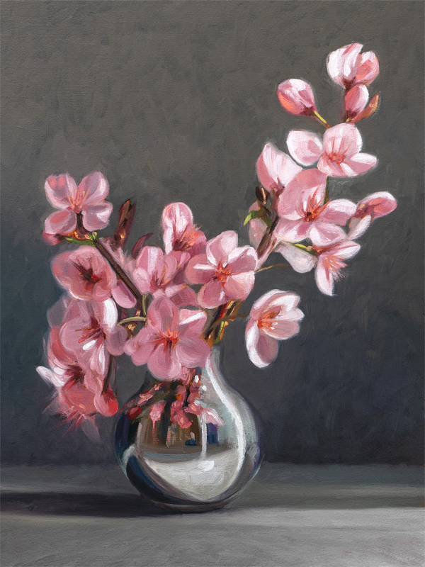 This painting features a reflective metal vase filled with pink cherry blossoms.