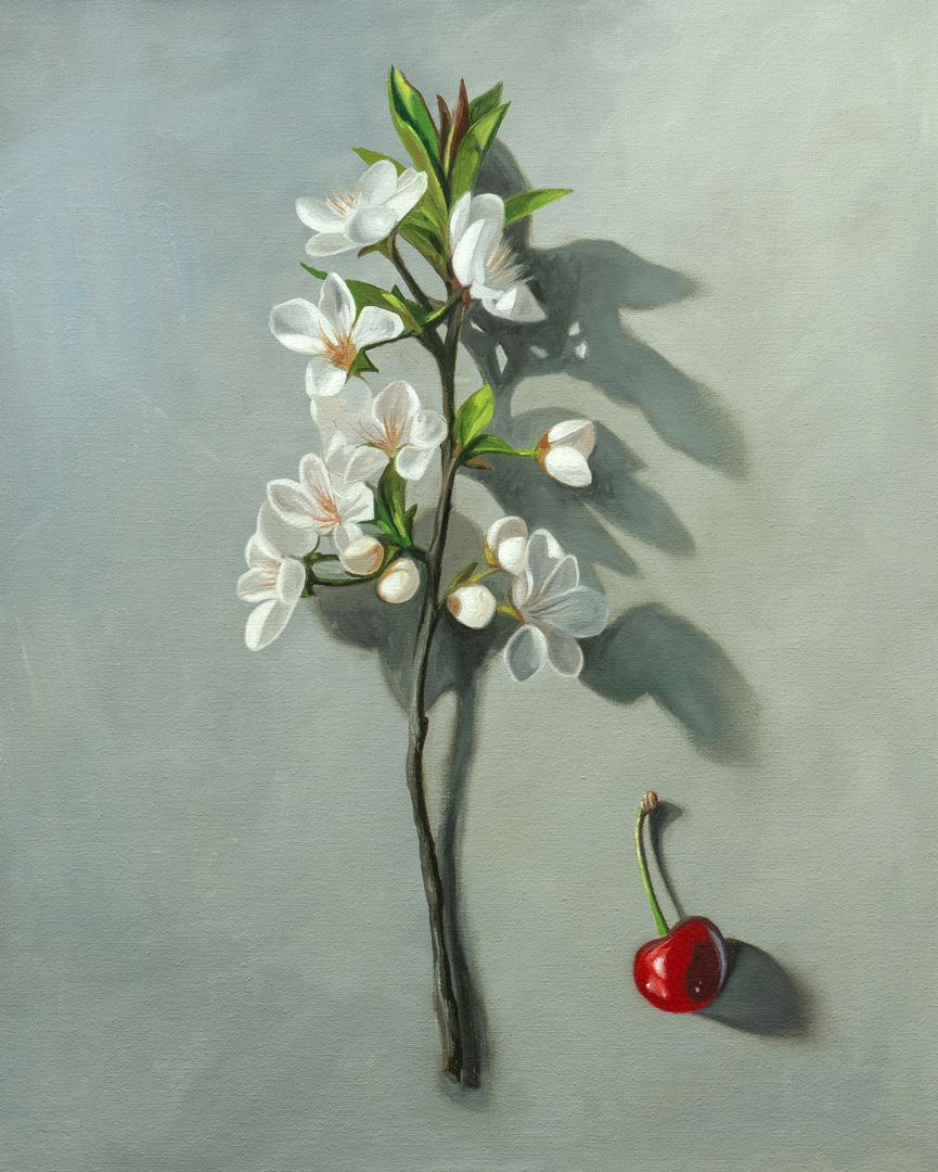 This painting features a single cherry alongside a bouquet of cherry blossoms.