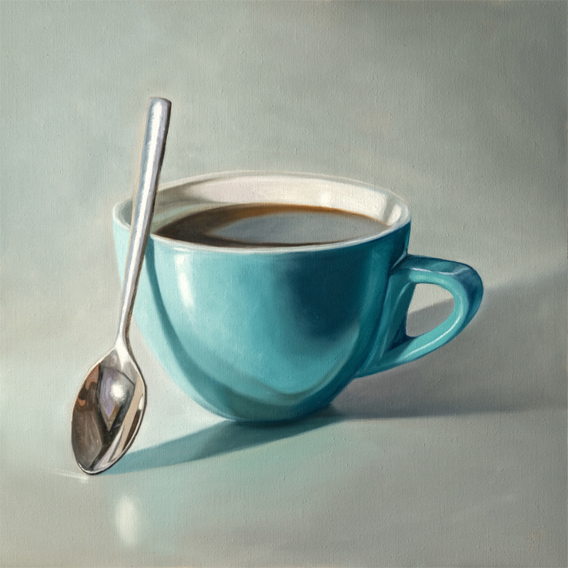 This painting features a reflective spoon leaning against a turquoise cup of coffee.