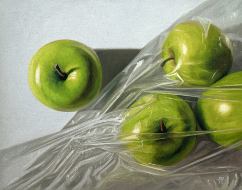 This painting features a top-down perspective of a lone Granny Smith apple resting on the exterior of a transparent bag filled with more apples.