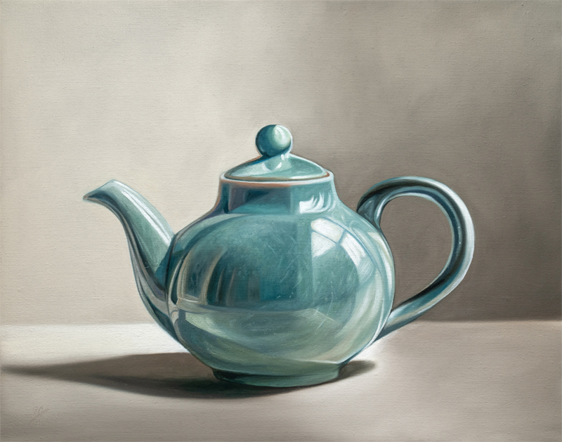 The painting features a turquoise teapot with luminous reflections from a nearby window.