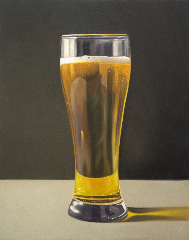 This painting features a freshly poured glass of pilsner beer set against a warm dark background.