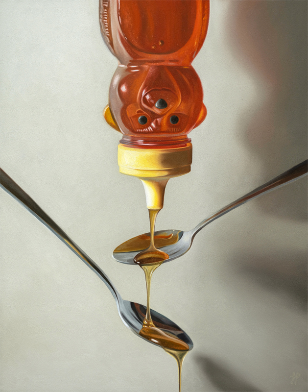 This oil painting features a honey bear bottle drizzling honey down to two spoons below.