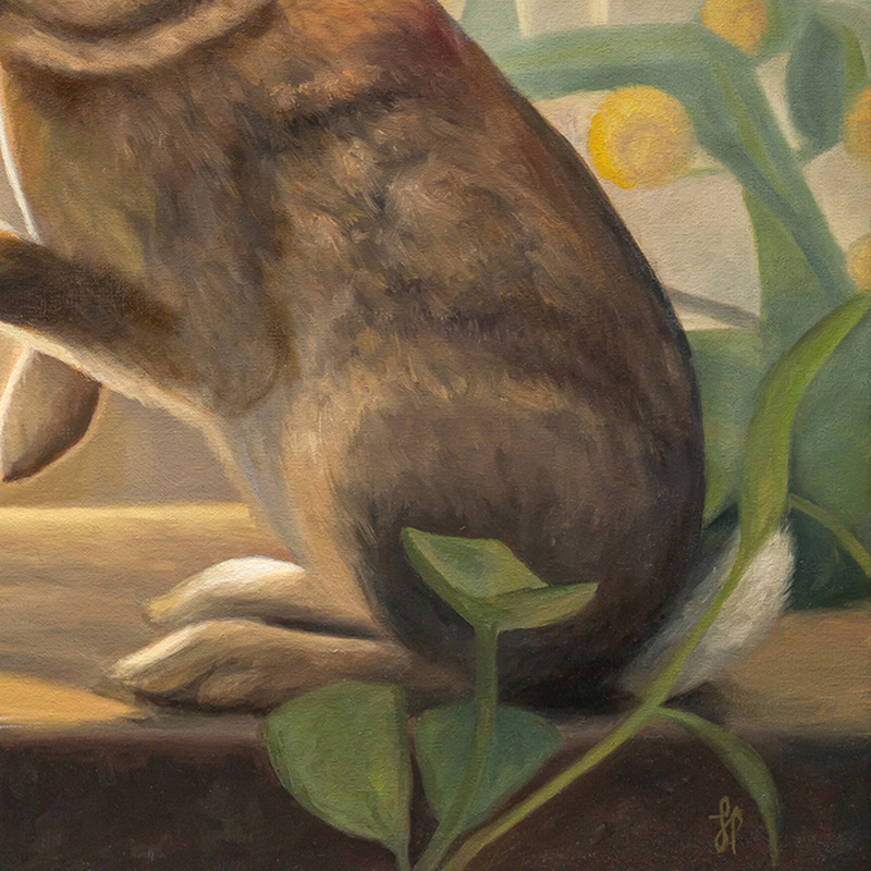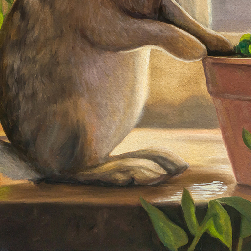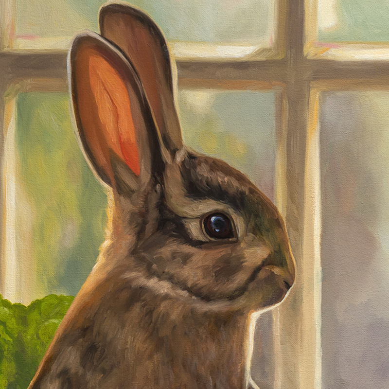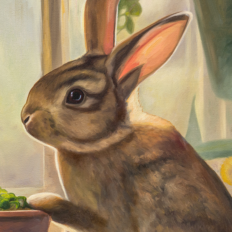 This painting features a pair of rabbits sitting at a windowsill, paws resting gently on a terra cotta pot overflowing with four-leaf clovers. Morning light spills through the window behind them, and the scene is full of quiet, leafy warmth—potted plants trailing from all directions, soft shadows catching along their fur.