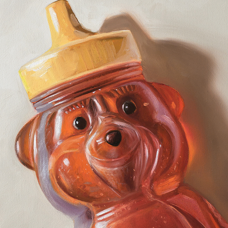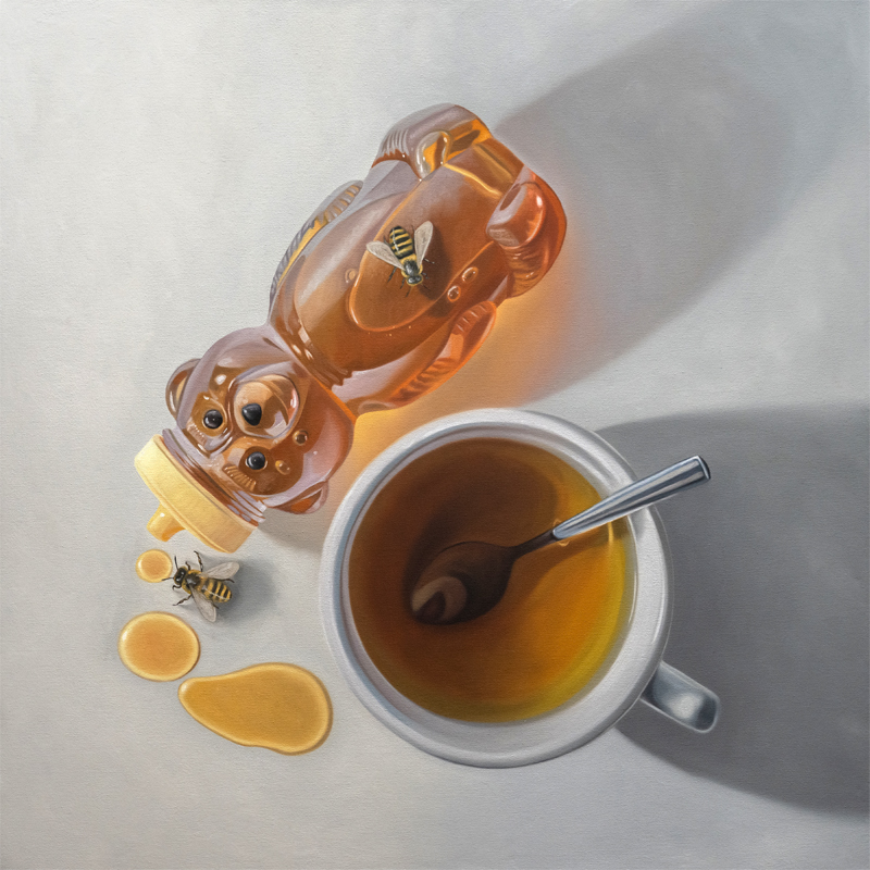 This week’s painting features a honey dripper angled from above with golden honey spilling downward into a smooth puddle on a simple surface. A single bee hovers just to the right, wings lifted as it inspects the rich, glowing honey. The scene is softly lit, emphasizing the warm amber tones of the honey against a muted background.