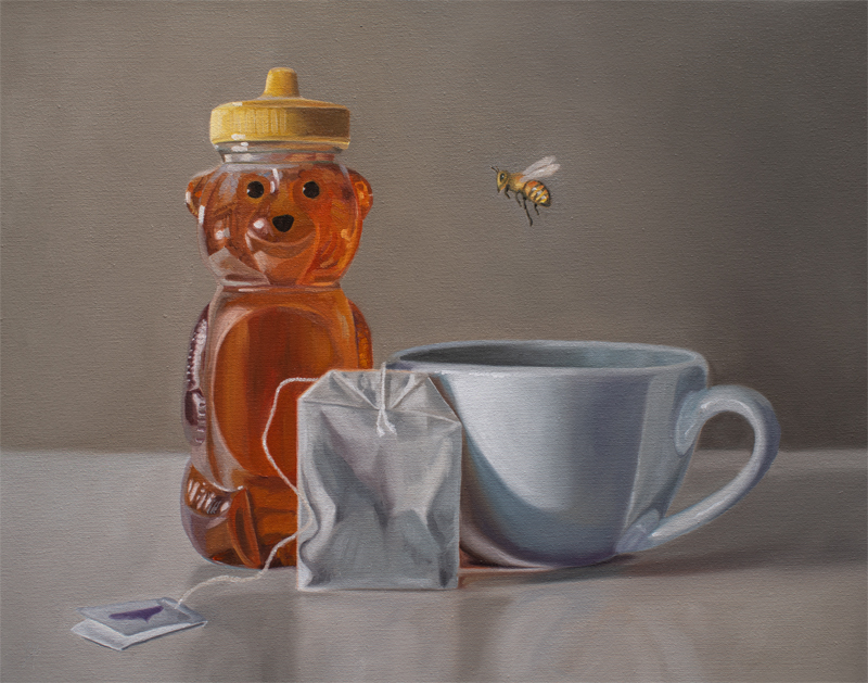 This painting features a tipped over honey bear surrounded by a trio of honey bees.