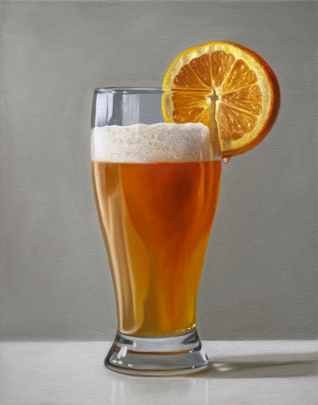 This painting features a freshly poured Blue Moon beer in a glass with an orange slice and a nice bit of foam.