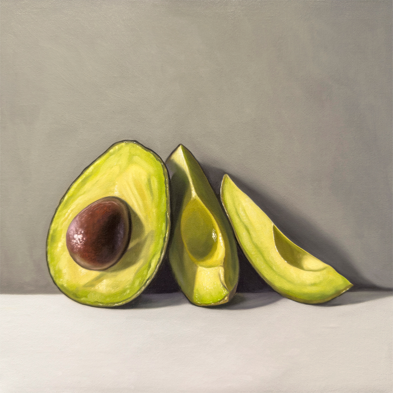 This painting features a trio avocado slices resting on a light grey surface with some nice dramatic lighting.
