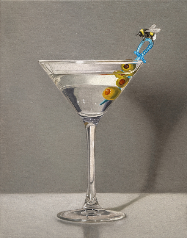 This painting features a martini with a bumble bee perched on a blue plastic cocktail sword with a trio of green olives and a neutral, minimalistic backdrop.