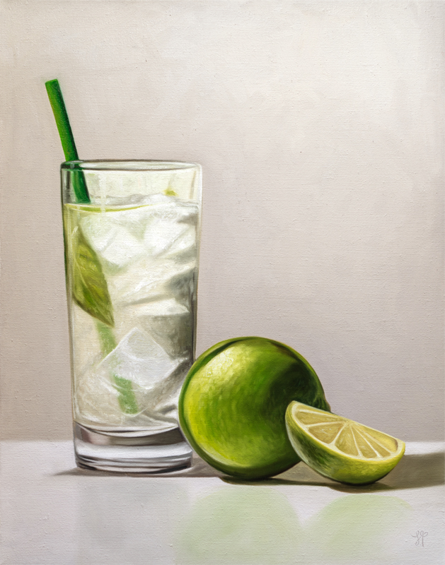 This painting features an ice cold mojito positioned alongside a lime and a lime wedge.