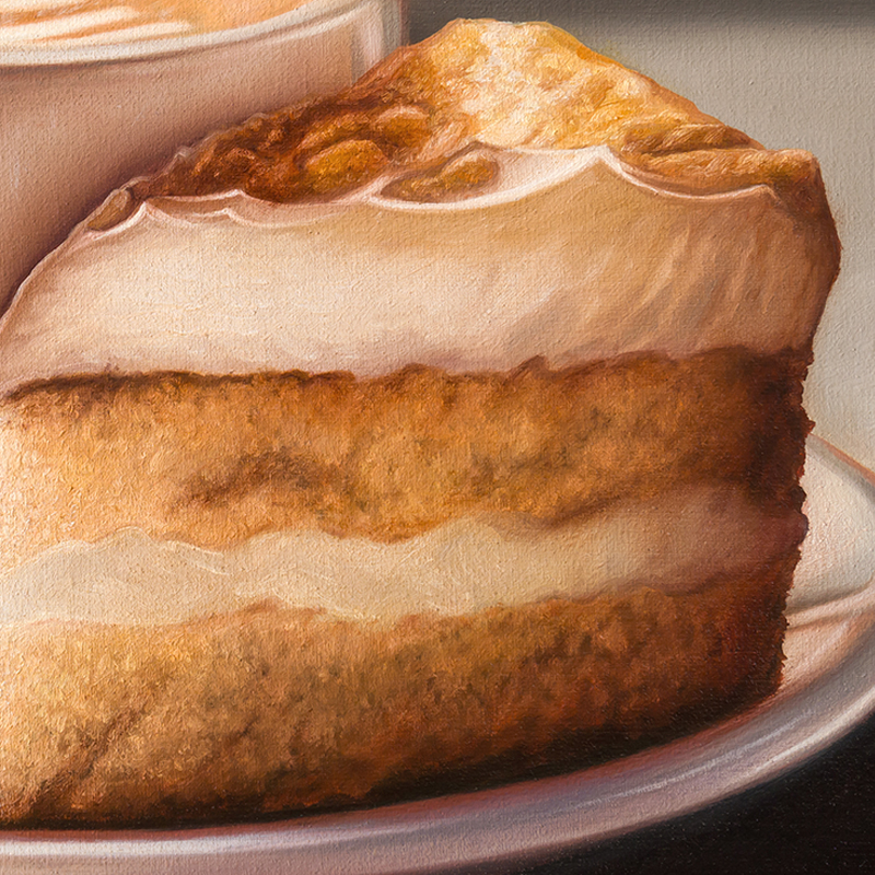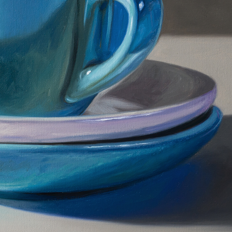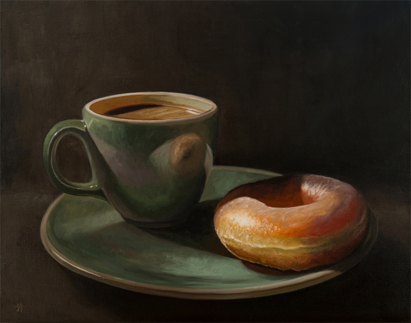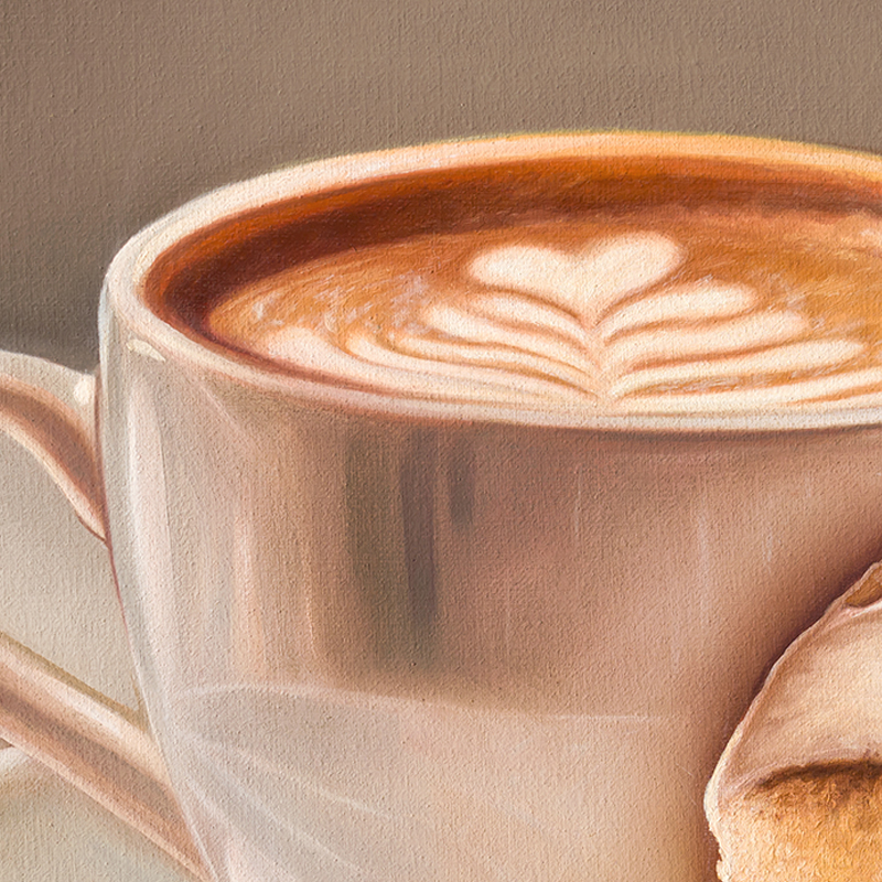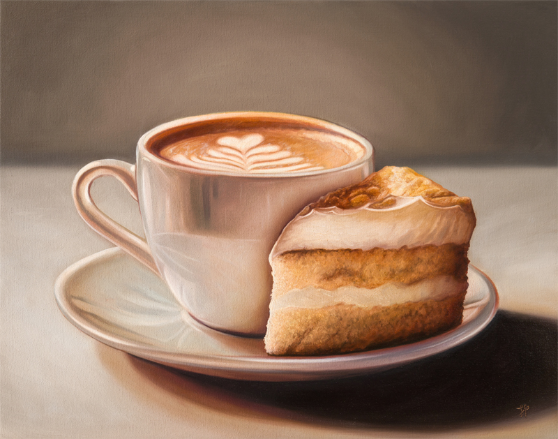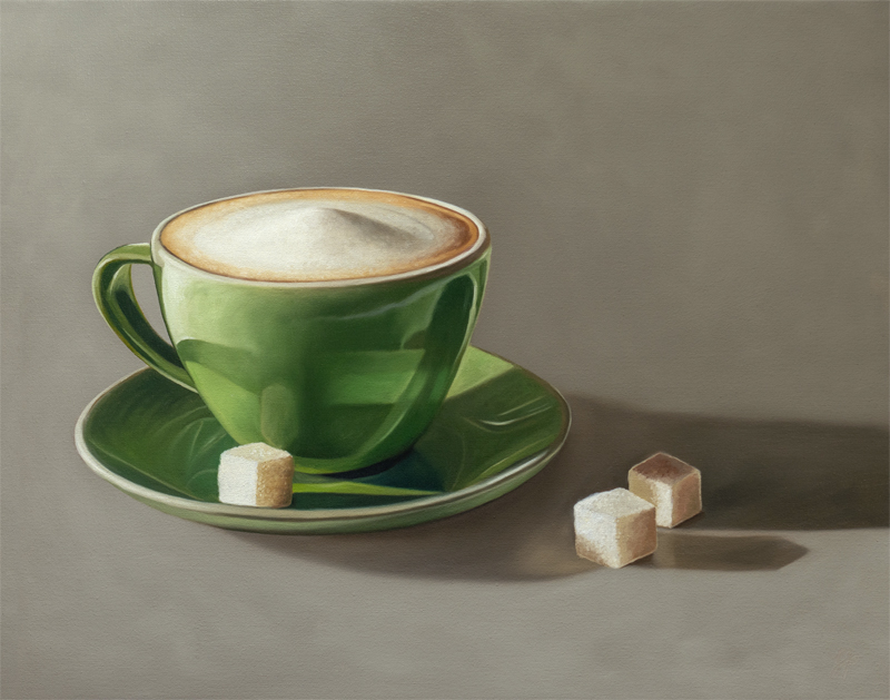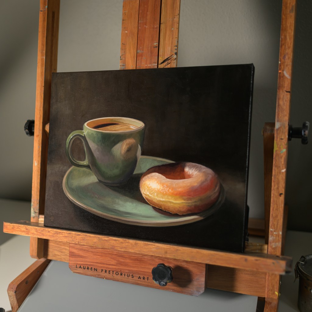 This week’s painting features a cup of coffee resting on a saucer beside a single caramel candy whose golden tones reflect onto the cup’s surface. The setup sits on a turquoise book, creating a gentle balance of warm and cool hues.