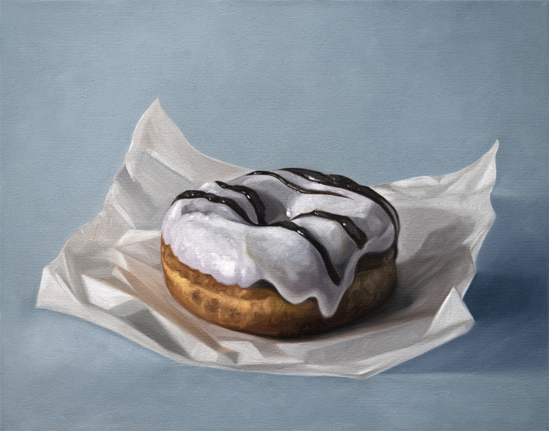 This week’s painting features a golden glazed donut leaning against a reflective moka pot. A shiny still life of quiet indulgence and mirrored mornings.