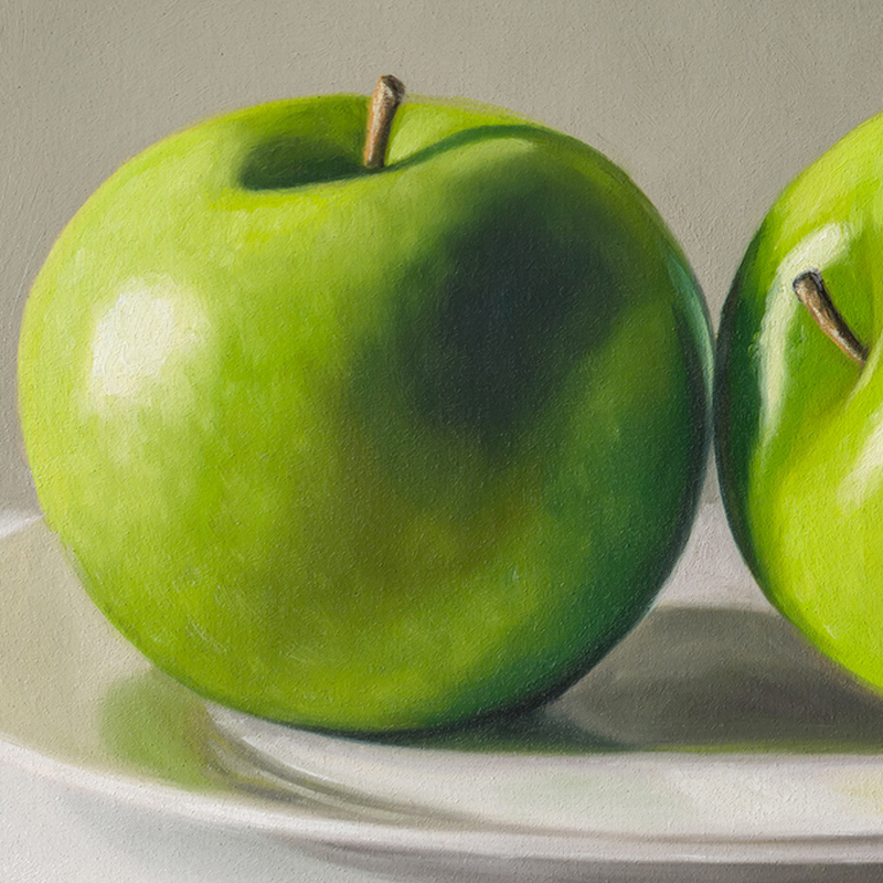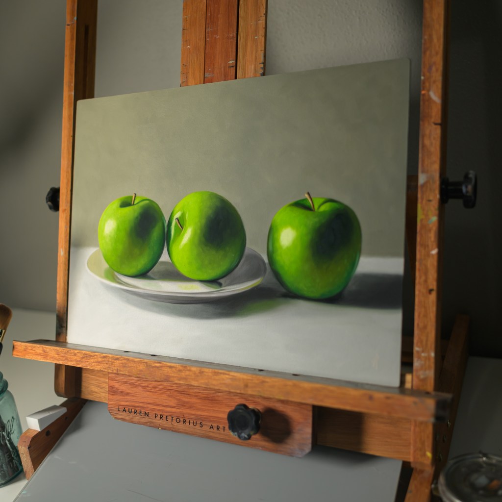 This painting features a single Granny Smith apple next to a paring knife. I was drawn to the crisp green of the apple and the way the light reflected off the metal blade. It’s a simple setup, but one that allowed me to focus on form, texture, and contrast. I also didn’t mind enjoying the apple when I was done with it! With peanut butter of course… 😉