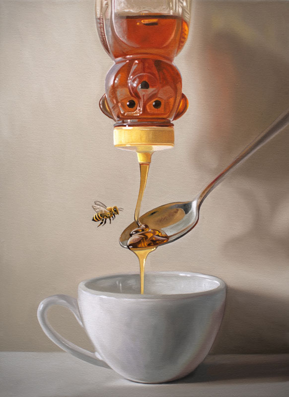 This week’s painting features a tipped honey bear bottle spilling warm golden light across a neutral surface. Three small gummy bears scatter nearby, catching the same glow and casting colored shadows. The painting explores transparency, reflection, and the soft warmth of sweet familiar things.