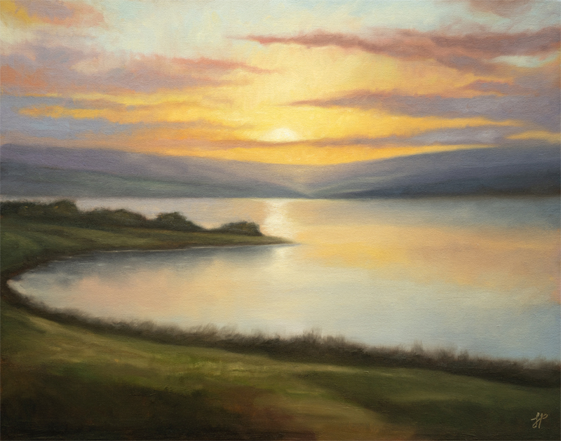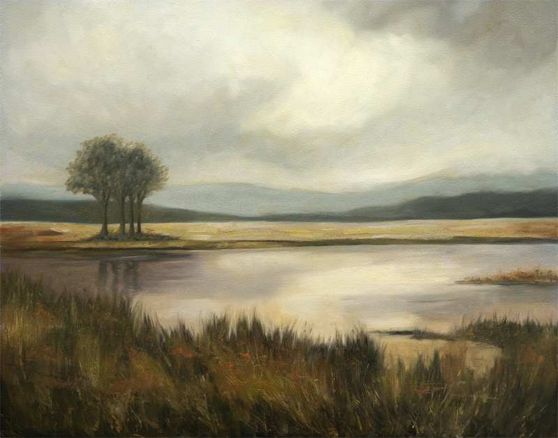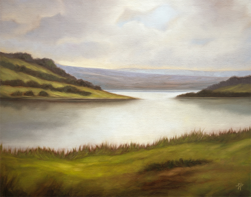 This artwork depicts a lake on an overcast day. Two land masses extend into the water, while in the distance, the landscape continues with atmospheric rolling hills.