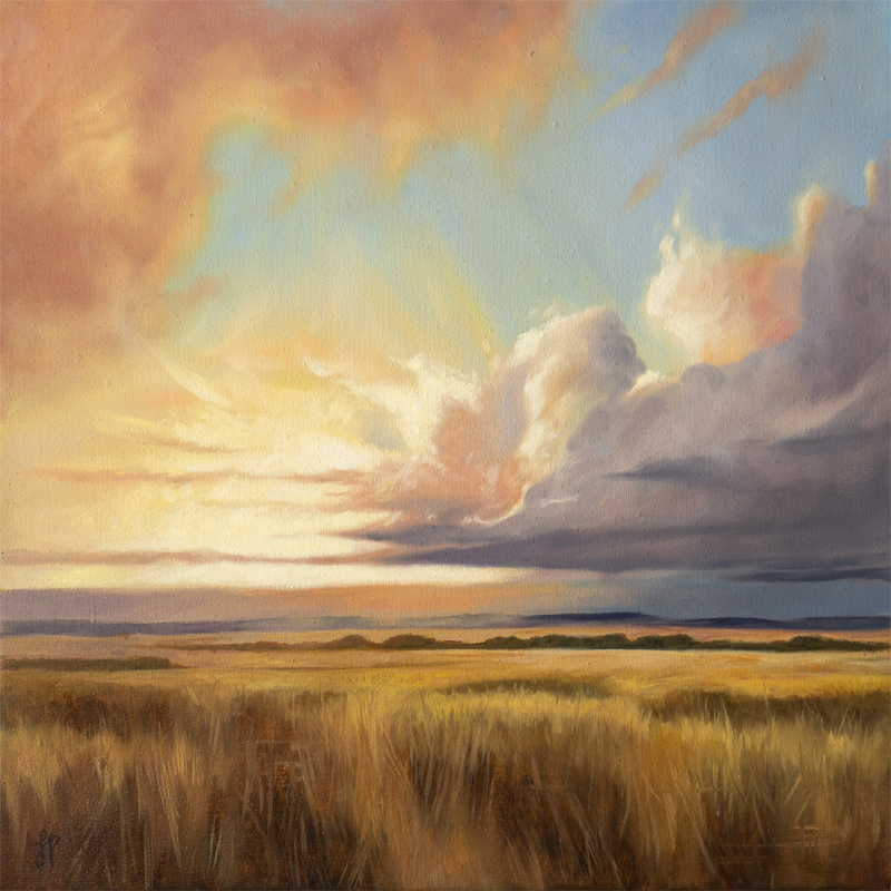 This painting features a late summer storm unfolding over the prairie near sunset.