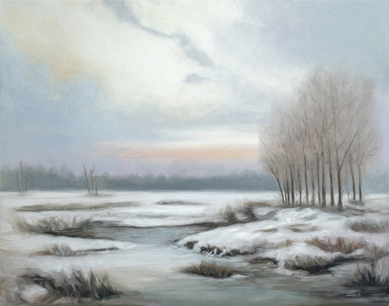 This painting features a tranquil stream on a cold and overcast winter morning.