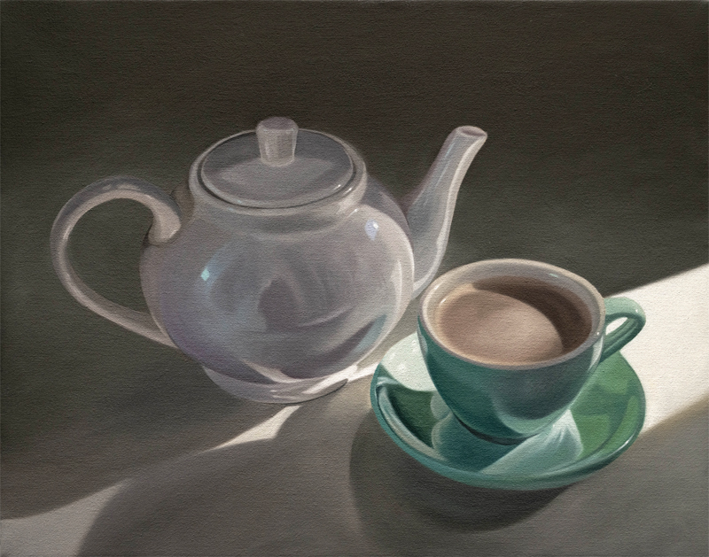 This painting features a white teapot and green cup with saucer resting in some nice morning light peeking in through a window.