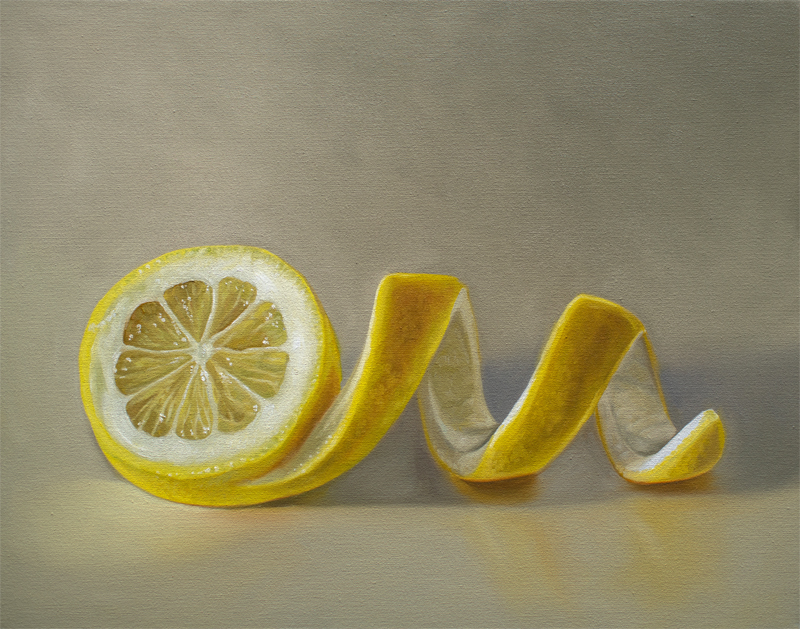 This painting features a sliced lemon with its peel coiling in a downward direction, highlighted with dramatic shadows and illumination.