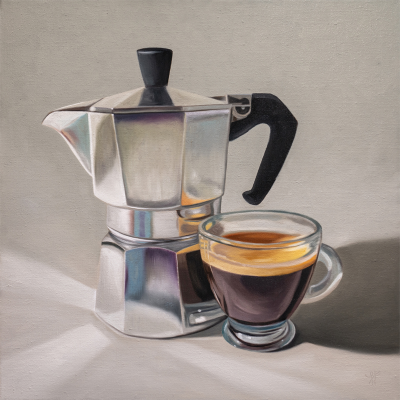 This week’s painting features a golden glazed donut leaning against a reflective moka pot. A shiny still life of quiet indulgence and mirrored mornings.