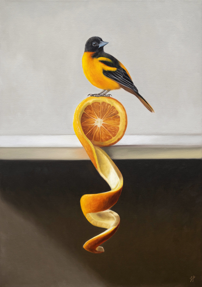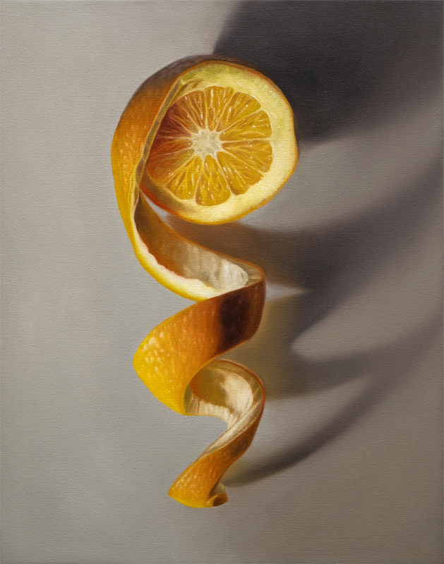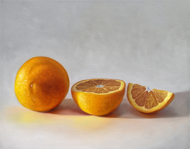 This week’s painting features a turquoise bowl filled with orange wedges, surrounded by a grey and white striped linen material. Gentle light from the left highlights the vibrant oranges and adds warmth to the scene.