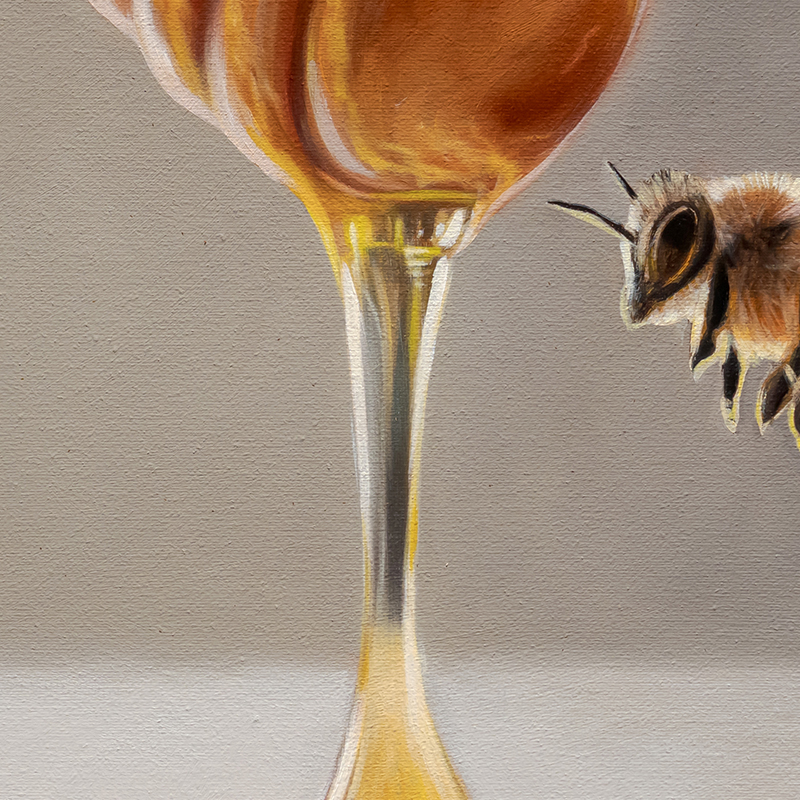 This week’s painting features a honey dripper angled from above with golden honey spilling downward into a smooth puddle on a simple surface. A single bee hovers just to the right, wings lifted as it inspects the rich, glowing honey. The scene is softly lit, emphasizing the warm amber tones of the honey against a muted background.