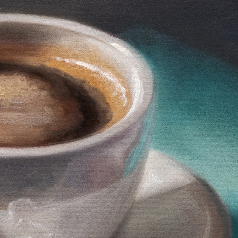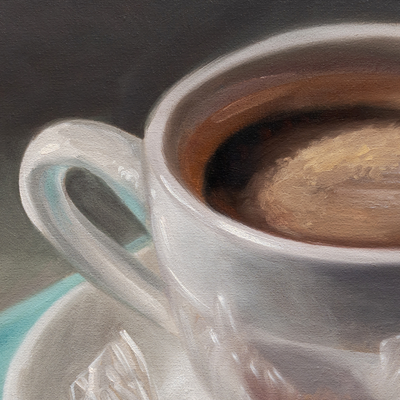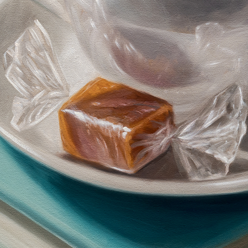 This week’s painting features a cup of coffee resting on a saucer beside a single caramel candy whose golden tones reflect onto the cup’s surface. The setup sits on a turquoise book, creating a gentle balance of warm and cool hues.