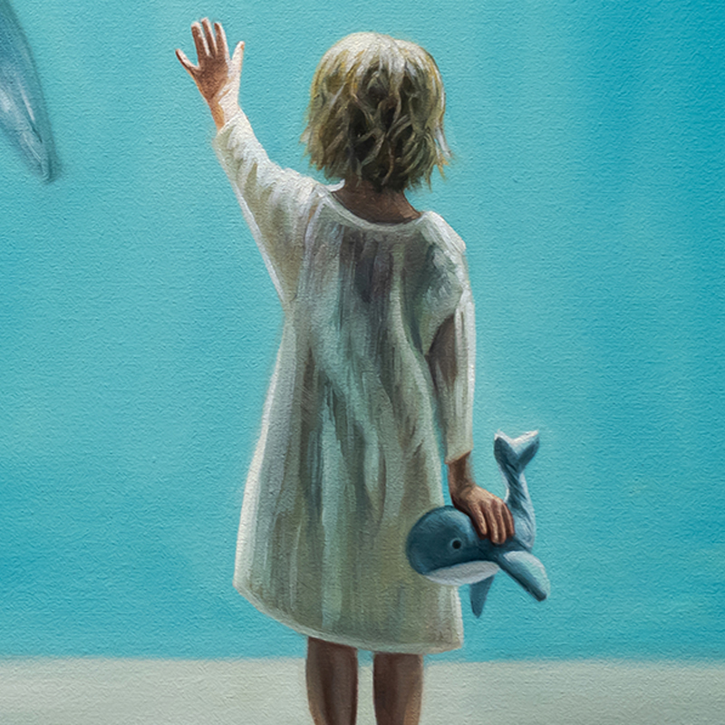 This week’s painting features a child standing barefoot at the edge of a luminous wall of water, her pajamas soft and simple, her stuffed whale toy hanging loosely at her side. A massive humpback glides effortlessly through the glowing blue, its form both powerful and peaceful. The girl reaches upward, meeting the whale in a quiet gesture that feels both serene and timeless.