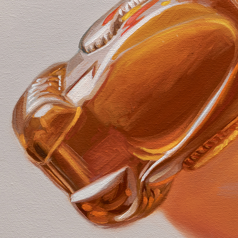 This week’s painting features a tipped honey bear bottle spilling warm golden light across a neutral surface. Three small gummy bears scatter nearby, catching the same glow and casting colored shadows. The painting explores transparency, reflection, and the soft warmth of sweet familiar things.