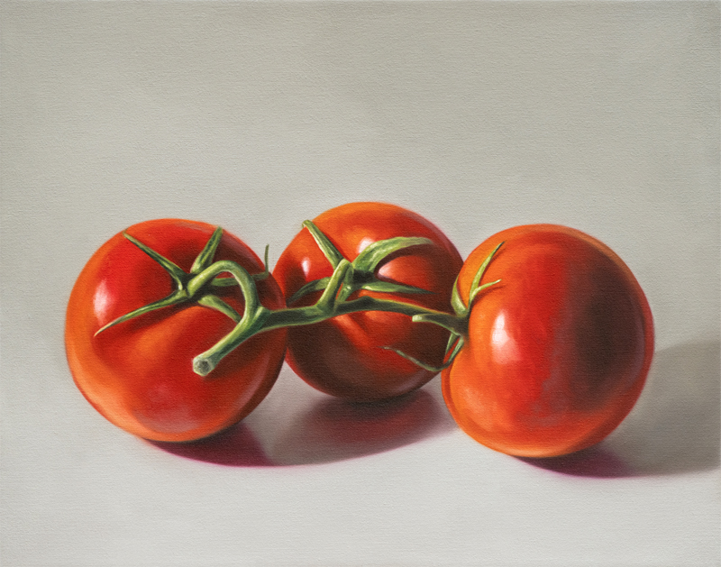 This painting features a trio of tomatoes still on the vine, resting on a light surface with some nice dramatic lighting.