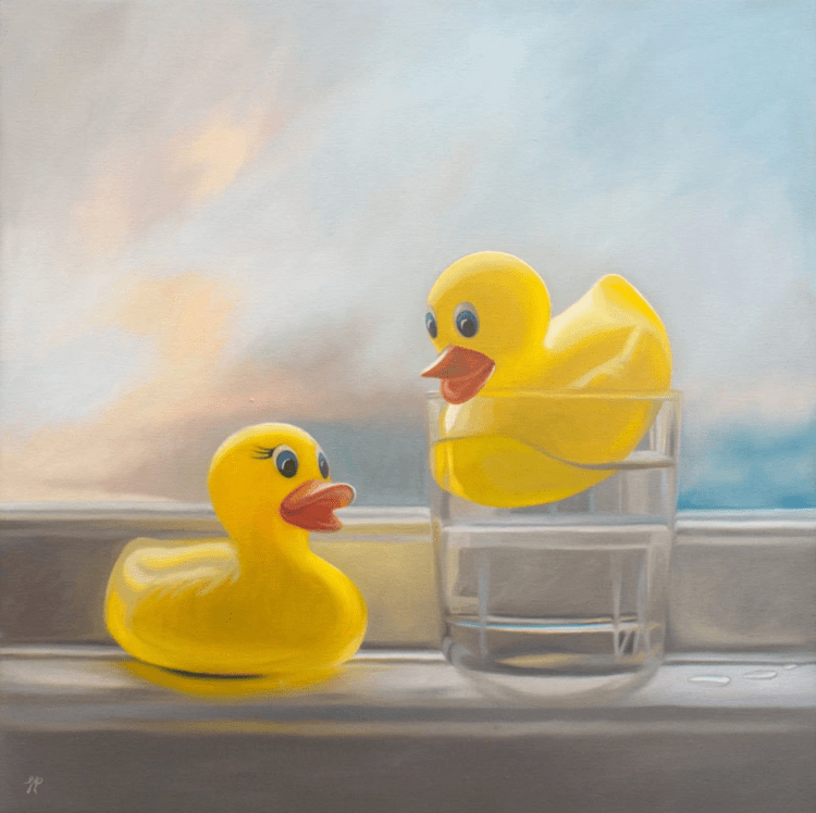 A pair of rubber duckies hitting the waves in a bathroom sink with some nice dramatic lighting.